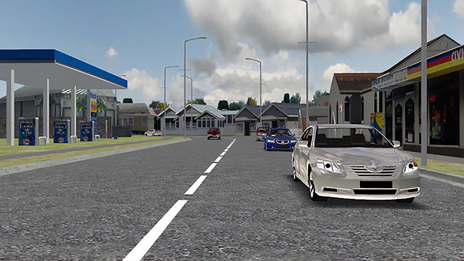 Working from a detailed specification as to the street environment and hundreds of location photos showing details of houses and shops in the Auckland suburb of Mt Eden, Animation Research constructed a Photo-Real Driving Environment including everything from council rubbish bins, to trees and parked cars. The finished result is a New Zealand looking-and-feeling urban landscape that drivers recognise and perform well within.